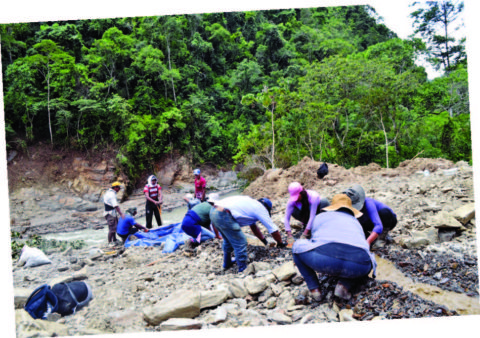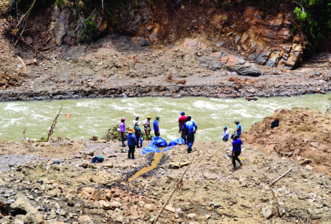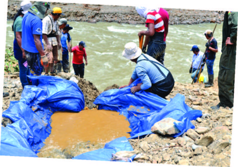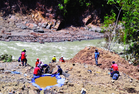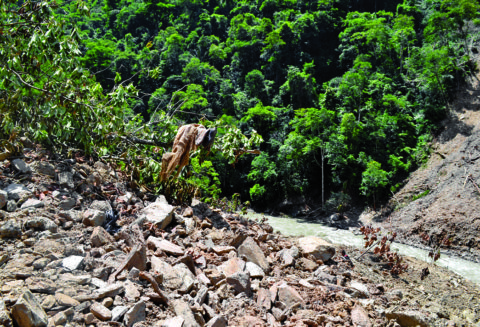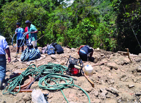 Se ingeniaron como pudieron. Un grupo aprendió una técnica. Represan agua que cae de la montaña escindida en un estanque improvisado con el fondo recubierto de un plástico azul. Luego sueltan por un surco que recorre el lodo reseco del derrumbe. El propósito es agrietar la tierra. Es una labor que repiten una y otra vez y todos los días. Otro grupo intercala el trabajo manual con pausas en silencio. Se recuestan sobre el hoyo y sumergen la cabeza en el mismo como si quisieran hablar con los muertos, pero en realidad tratan de captar el olor de los cuerpos en descomposición.