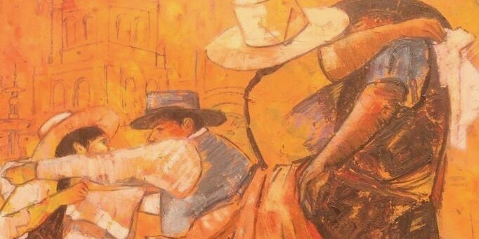 De pronto, cueca y el encuentro con un eterno perseguidor que fundó leyendas de amor en mis memorias rucas, una biblioteca andante, hombre amante de Cortázar, yo su maga andina. Además de no saber bailar, tuvo nomás que acceder a mi invitación y sumarse a las convenciones que supone la danza de a dos, al debate del amor en silencio, a la construcción de guiños y miradas tristes. La cueca era perfecta para nosotros, dos perdedores: Mi pena, de Jaime del Río.