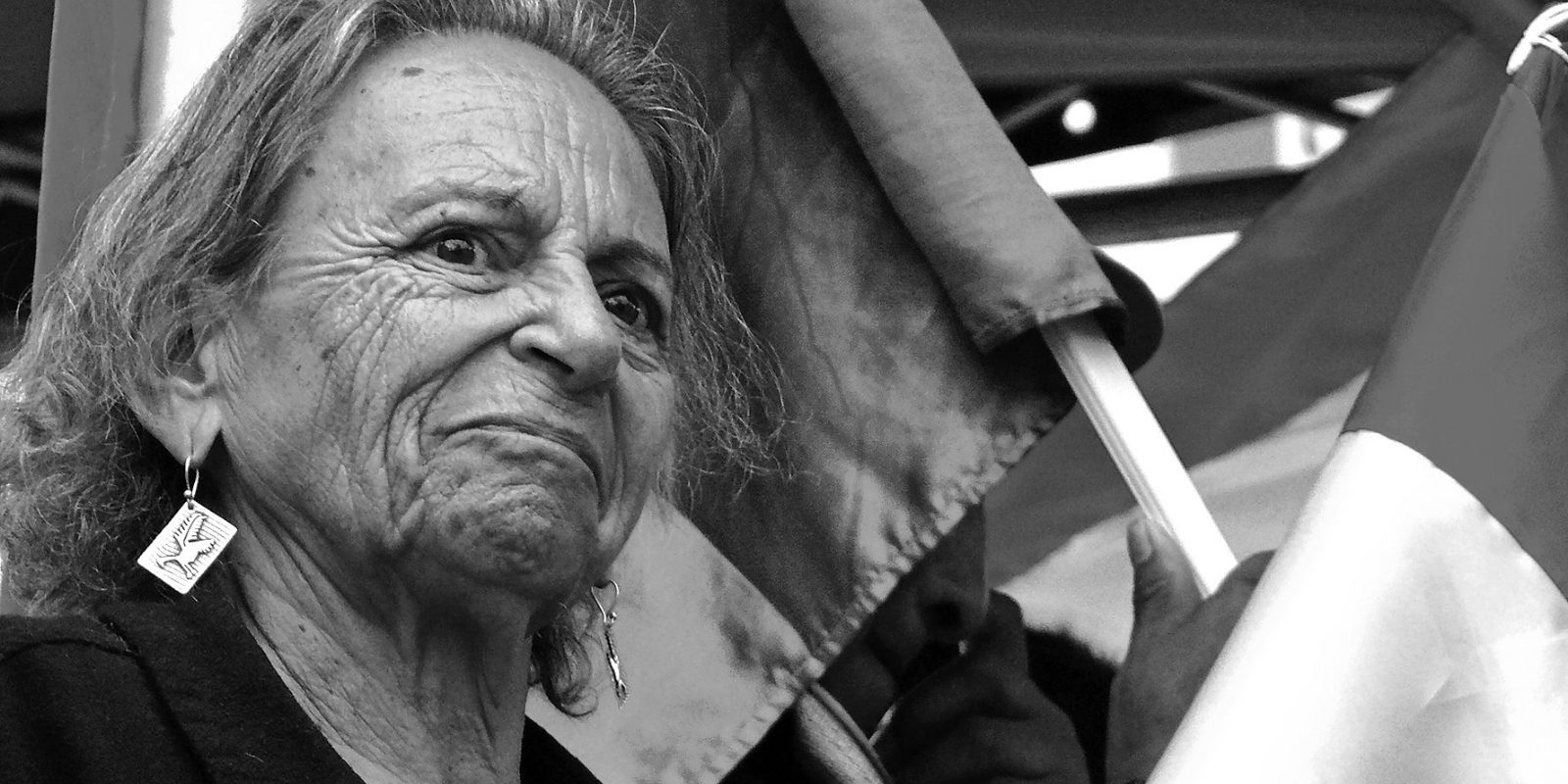 Hace poco vi a Amparo Carvajal alzando la bandera y mirando orgullosa el poder de una convocatoria, pero también con una mirada que se mezclaba con la historia de haber visto tanto muerto a sus pies, y con ese capricho convencido de querer hacer lo justo. Le ofrecieron una silla para sentarse, agradeció, pero no se sentó, siguió apoyada en el bastón que la sostiene hace algunos años y continuó mirando sorprendida a la gente. Ella no habla con venganza, ni odio –exclama a la multitud- sino que cree que es necesario luchar por esa justicia que no camina. Cuando le tocó decir lo suyo, pidió un minuto de silencio, y en ese momento me la imaginé rezando en las noches en un cuarto sencillo o en la celda de algún preso o en la selva desolada o entrando a la Cruz Roja.