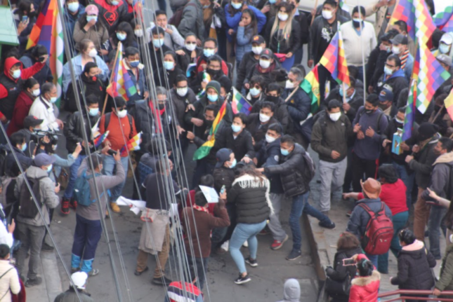 Una tarde muy tranquila, las sirenas quebraron el silencio anunciando la llegada pomposa de las primeras vacunas. Las marchas fueron cosa de todos los días, con petardos que estallaban exactamente a la altura de mi dormitorio y aterrorizaban a mi perra; vi pasar a todo tipo de marchistas, a menudo con dirección al Ministerio de Educación. También vi a masistas que golpeaban con palos y wiphalas a quienes protestaban con banderas bolivianas, y me encontré con similares aguerridos militantes que agredían las instalaciones de la Asamblea Permanente de Derechos Humanos.