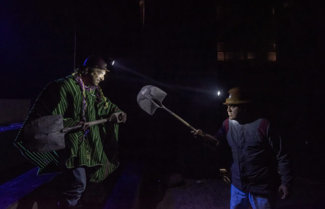 Un corredor, a la manera del ingreso al socavón, se ha dispuesto con sillas frente a frente. En ellas se acomodan los espectadores, mientras que en los extremos y en el centro se suscitan las acciones a cargo de cuatro actores y una actriz que van a multiplicarse en personajes reales y algunos fantásticos. Las graderías que suelen ser el espacio del público, esta vez hacen del interior mina, con la figura del Tío velando desde lo alto.