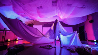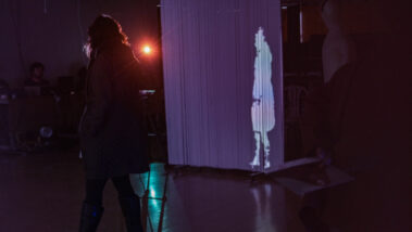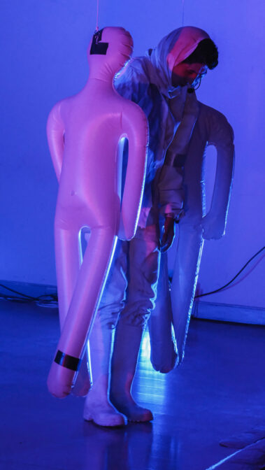 Sin aliento, creación desarrollada como parte del proyecto Cuerpos Dialogales (“), comienza con un recorrido del público por una exposición en la que, en virtud de sensores, los cuerpos de la gente se hacen parte de la muestra a la manera de sombras en movimiento. Otros estímulos visuales y sonoros plantean claves que adquirirán sentido para los espectadores cuando éstos los vean aparecer en la propuesta escénica.