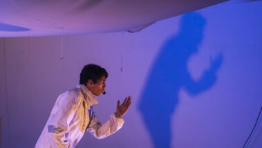 Jorge Barrón es Jorge. Con su mascarilla de oxígeno y vestido con asepsia ajena a la del trabajador minero, le habla al público. Desde un costado del escenario, alguien del equipo que maneja los recursos técnicos, a ratos va a interrogarlo.