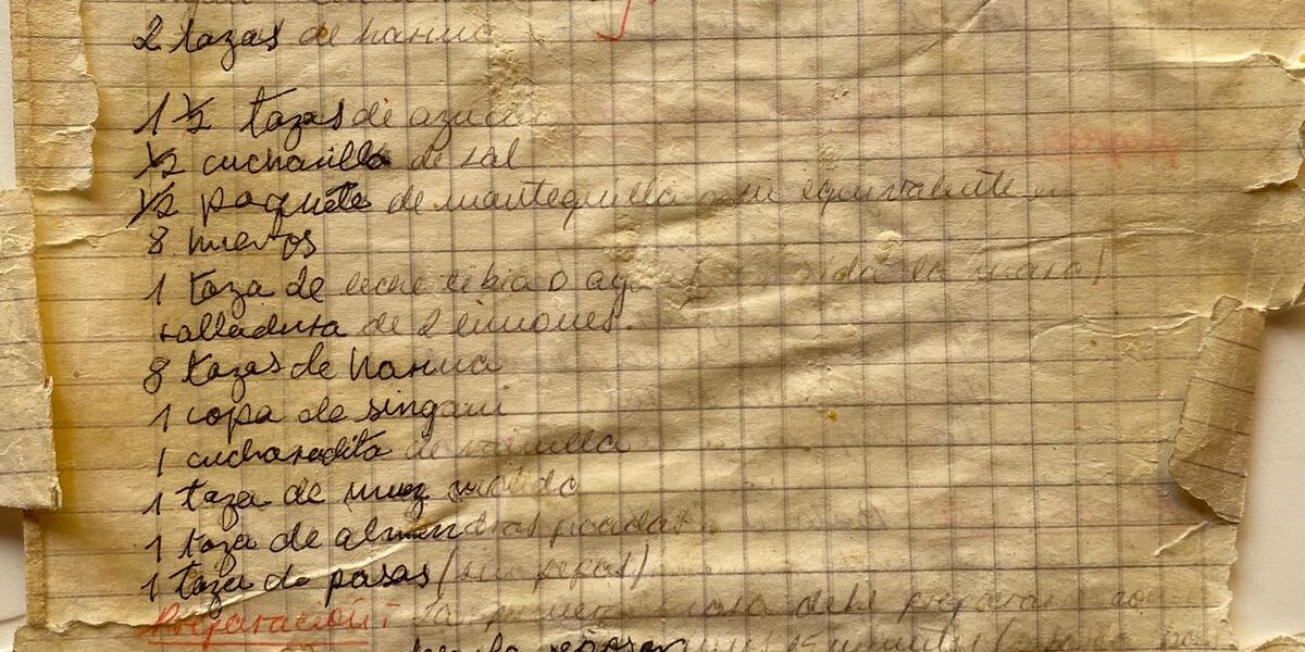 El año pasado le he tomado una foto a la página del recetario en la más alta calidad que he podido, derrotado ante el inminente deterioro del papel. Estos días prenavideños me he dedicado a transcribir la receta para llevársela a mi abuela en una hoja impresa y poder preparar el panetón sin las deducciones de la letra y la memoria. Me ha costado comprender varias partes y las que ya se han borrado las he completado con los recuerdos de lo que he aprendido de mi abuela. Mi mamá me ha ayudado a entender algunas partes de la letra palmer. “Es mi letra”, me dijo, contándome que ella había transcrito años atrás las recetas de mi abuela desde un recetario ya desaparecido.