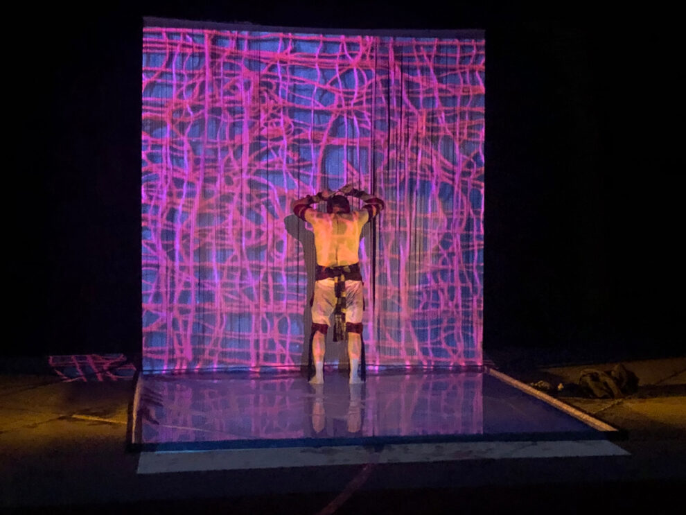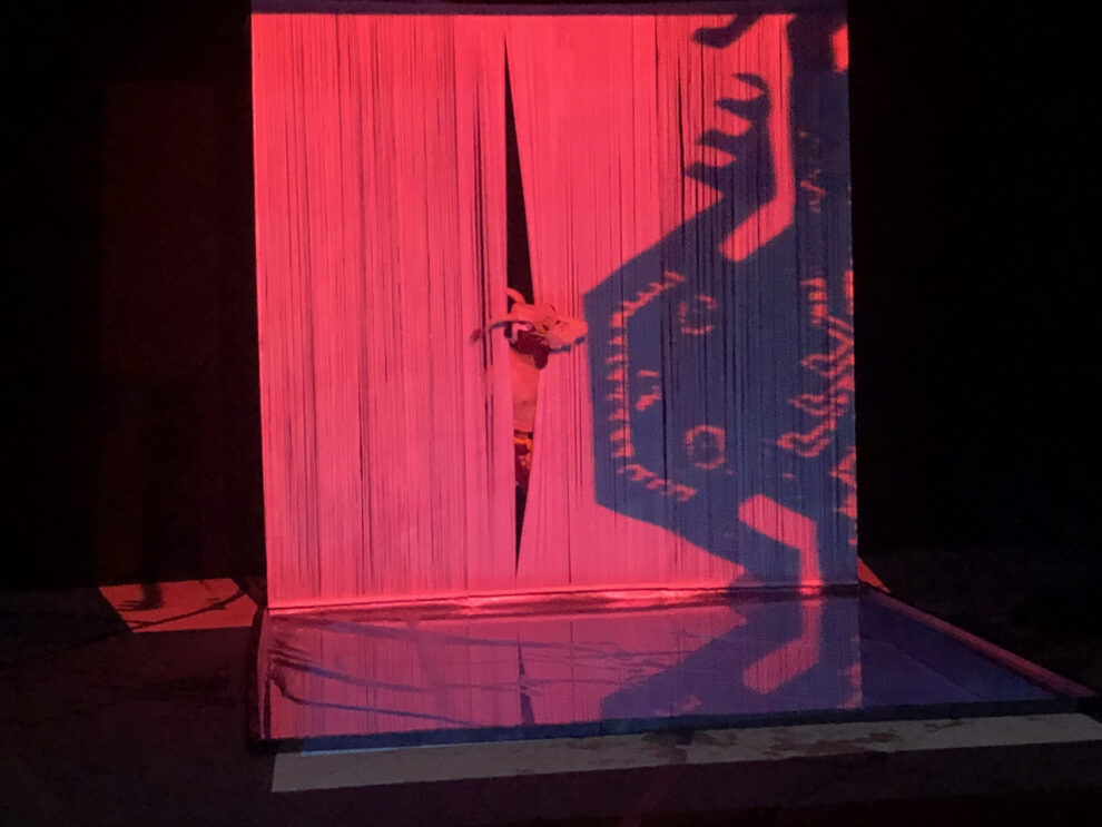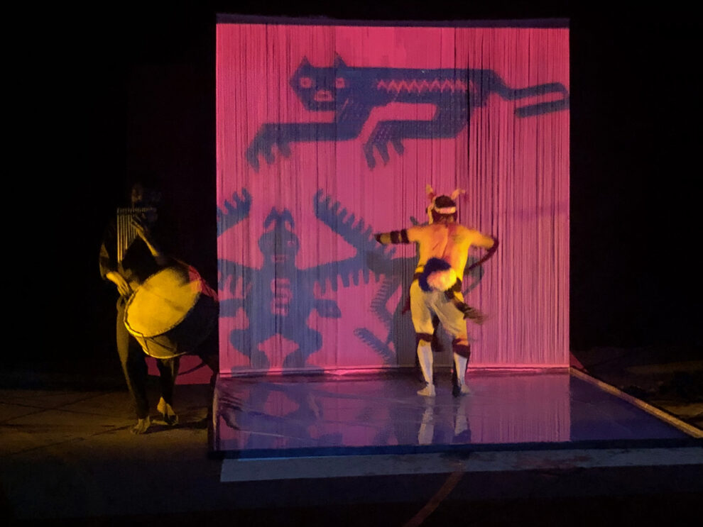 A las 20:00 Gonzalo grita desde platea kanjina Braulio, kanjina Orlando, kanjina Alice, kanjina tatay, kanjina mamay y varias voces desde el público responden kanjina. Gonzalo no traduce la palabra, como sí hizo en la primera función de esta obra en el teatro Nuna durante la realización de EYYY! 2024 Yvyrasacha. Ahí nos dijo que kanjina significa igual que vos soy/estoy y que la gente en el campo se saluda con esta palabra. Luego del saludo, Gonzalo, como un narrador oral, nos cuenta en quechua quién es, de dónde viene y por qué habla quechua. Narra también fragmentos de la vivencia con su abuela y cómo ella fue un vínculo con los tejidos jal’qa, con el tinku, con la relación con otros seres como los khurus, a quienes nunca hay que mirar, pero que él con la curiosidad de un niño mira y luego se enferma hasta estar a punto de morir. Después del relato, Gonzalo cual Dante en La Divina Comedia, inicia un recorrido por el tiempo y el espacio del Kay pacha, Uku pacha y el Hanan pacha con el recurso del mapping y la estructura escenográfica hecha de algo que se asemeja a un telar. Antes de ingresar a esta otra espacialidad se despoja de su vestimenta y en ese momento se escuchan primero risas pícaras en el público e inmediatamente después se siente una atmósfera de tensión, como si cada uno de los espectadores estuviese conteniendo la respiración por algo que no debe ser o es peligroso mirar. Entonces recuerdo lo que Denisse Arnold menciona sobre “cambiapieles” en la tradición oral andina, así como la pregunta que hace sobre cuán conscientes estamos de estar vistiendo y desvistiendo el mundo. Me parece que la desnudez en las comunidades andinas no sólo es cuestión de moralidad e inmoralidad, sino algo más complejo.