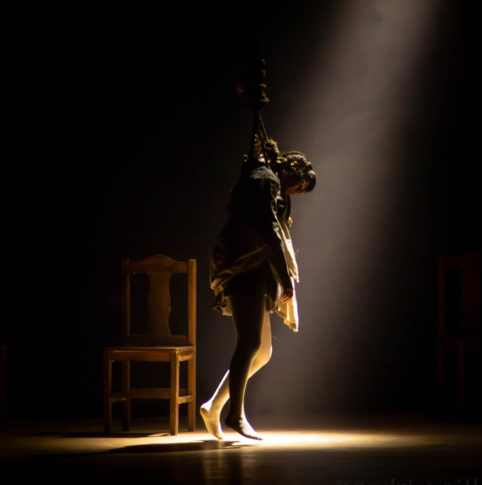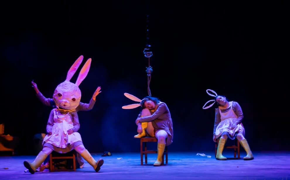 Los primeros instantes de El Orfanato muestran al escenario con una iluminación mínima texturizando el humo. De repente, mimetizada en la oscuridad, aparece Lourdes, una niña preadolescente que comienza a recorrer el escenario con la compañía de una máscara de cabeza de conejo. El sonido ambiente se engruesa. Lourdes descubre una cuerda sujetada al techo y una silla debajo; una vez arriba de la silla, pone la cuerda alrededor de su cuello para después saltar al vacío. Suena a spoiler, pero se trata de la propuesta inicial de su directora Stephie Bastías: desafiar al público ética y narrativamente.
