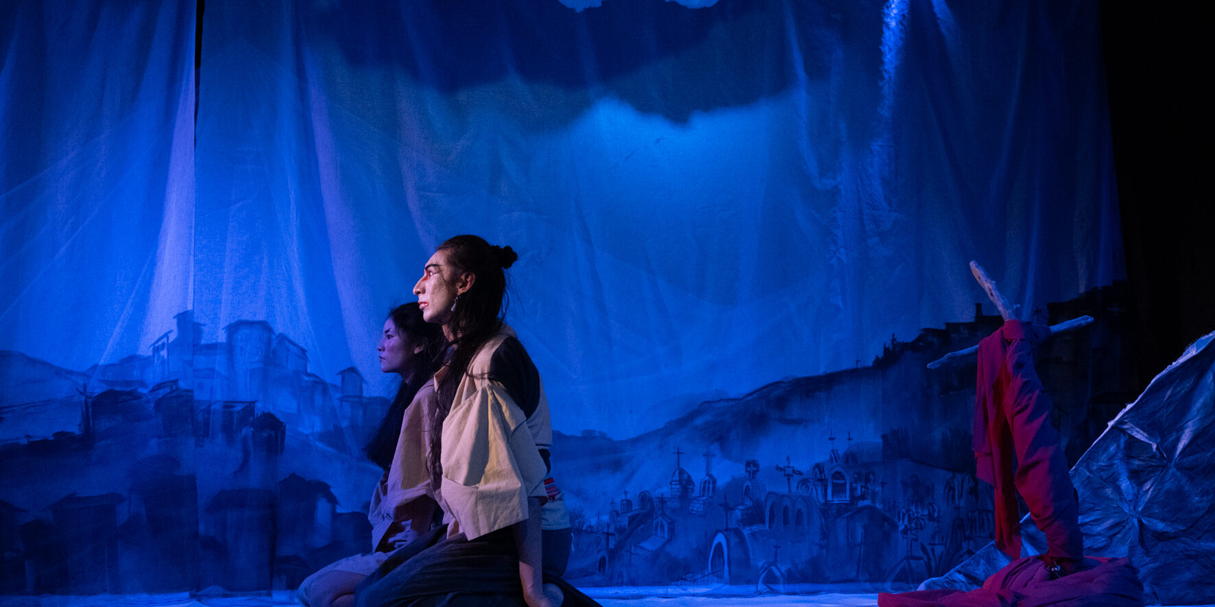 Un desconcierto, decíamos, el efecto ya no de imagen, sino de sonido de los mellizos Gonzales (Marcelo y Anki), que acompañan con lectura y música la obra, mientras Edwin Villarroel y Raquel Márquez ponen el cuerpo a la escena, ayudados por una marioneta bunraku, cuya tradición influencia el desarrollo de toda la puesta en escena. O sea, títere, narración y música. El florecimiento del cerezo es la experimentación de esta técnica a partir de aquella similitud de paisaje y frecuencia de sonidos.