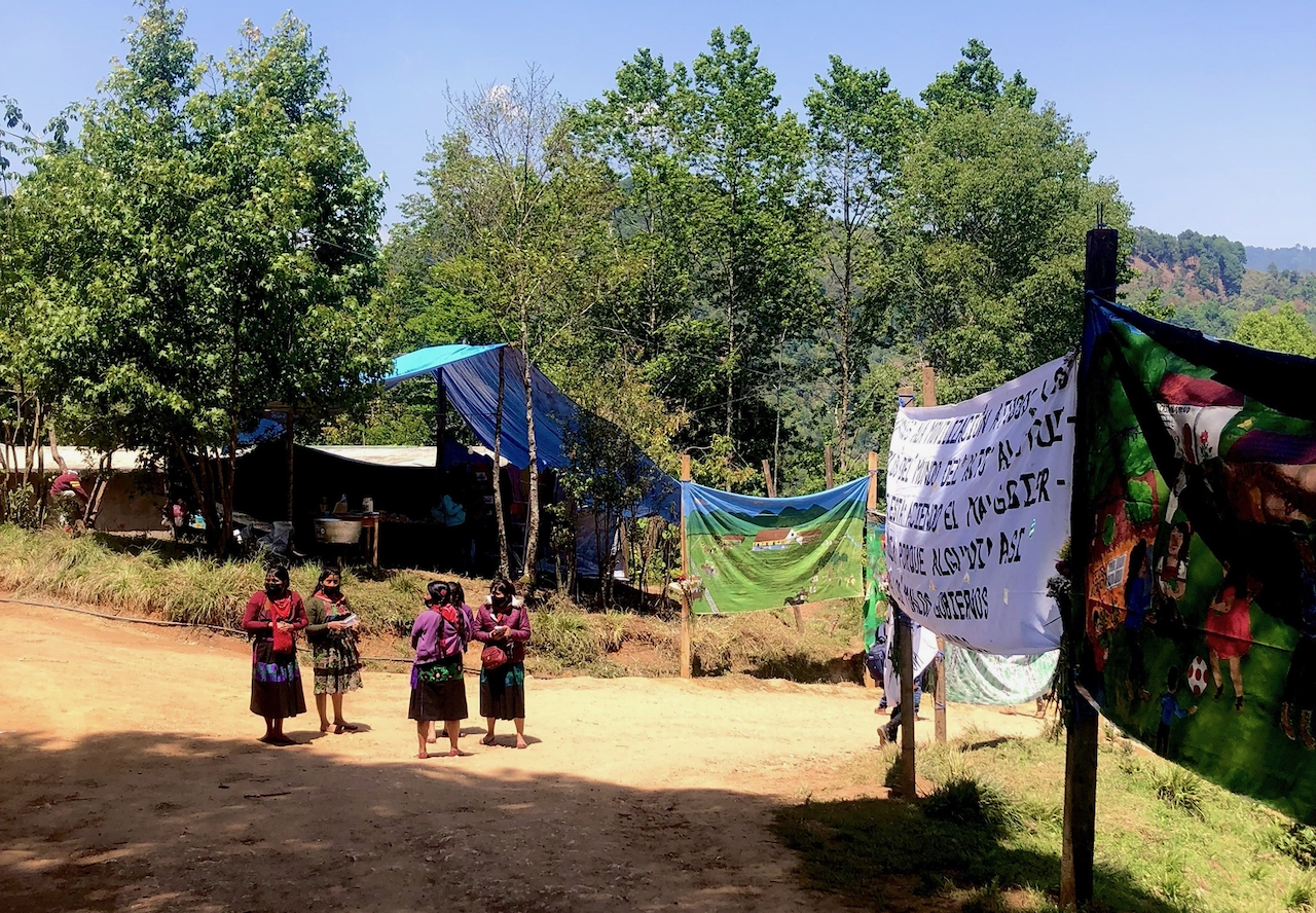 — Mis hectáreas ahora son del caracol. Nosotros decimos para nosotros nada, para todos todo—. Le echa salsa picante al tamal y me lo da con una cucharita. Atrás, sobre unos cartones en la tierra, se ven unos bultos cubiertos con mantas. Son sus nietas que ya están durmiendo. Él me cuenta sobre el caracol.