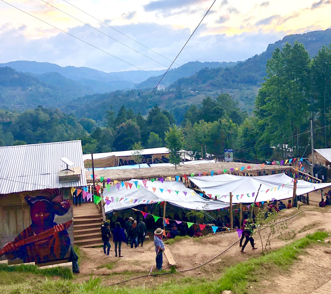 A ambos costados de esa área hay construidas casas en madera donde funcionan las diferentes áreas del común que constituye un caracol: un lugar para reuniones y la Junta del Buen Gobierno, un espacio para los Tercios Compas (el área que se encarga de la comunicación audiovisual), una frutería, la sala de salud autónoma, una despensa, y varias casetas con camas para quienes se quedan a pasar la noche (en este encuentro muchxs dormiremos en la escuela, en el patio de juegos, bajo lonas en la montaña).