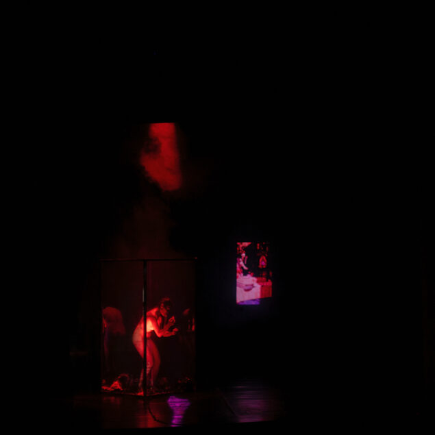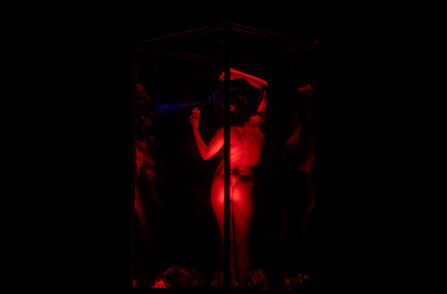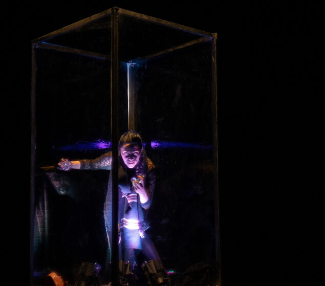 Ese espacio, iluminado desde el interior con luces LED frías, se convierte en un útero escénico donde la multiplicidad de Hamlet se reconfigura. El diseño escenográfico, austero pero eficaz, se sostiene con coherencia conceptual: todo ocurre ahí dentro, sin más ornamento que el cuerpo en transformación y una utilería mínima que adquiere peso simbólico. La iluminación —a veces tenue, a veces cortante— genera un juego de reflejos en el que la figura de Camila se duplica y hasta triplica en el plástico que la encierra. Su cuerpo, ondulante como una masa líquida, se descompone y recompone con movimientos envolventes y tensos mezcla de danza contemporánea y teatralidad gestual. La corporalidad es texto. El silencio, subtexto. Y la voz, un eco íntimo y feroz.